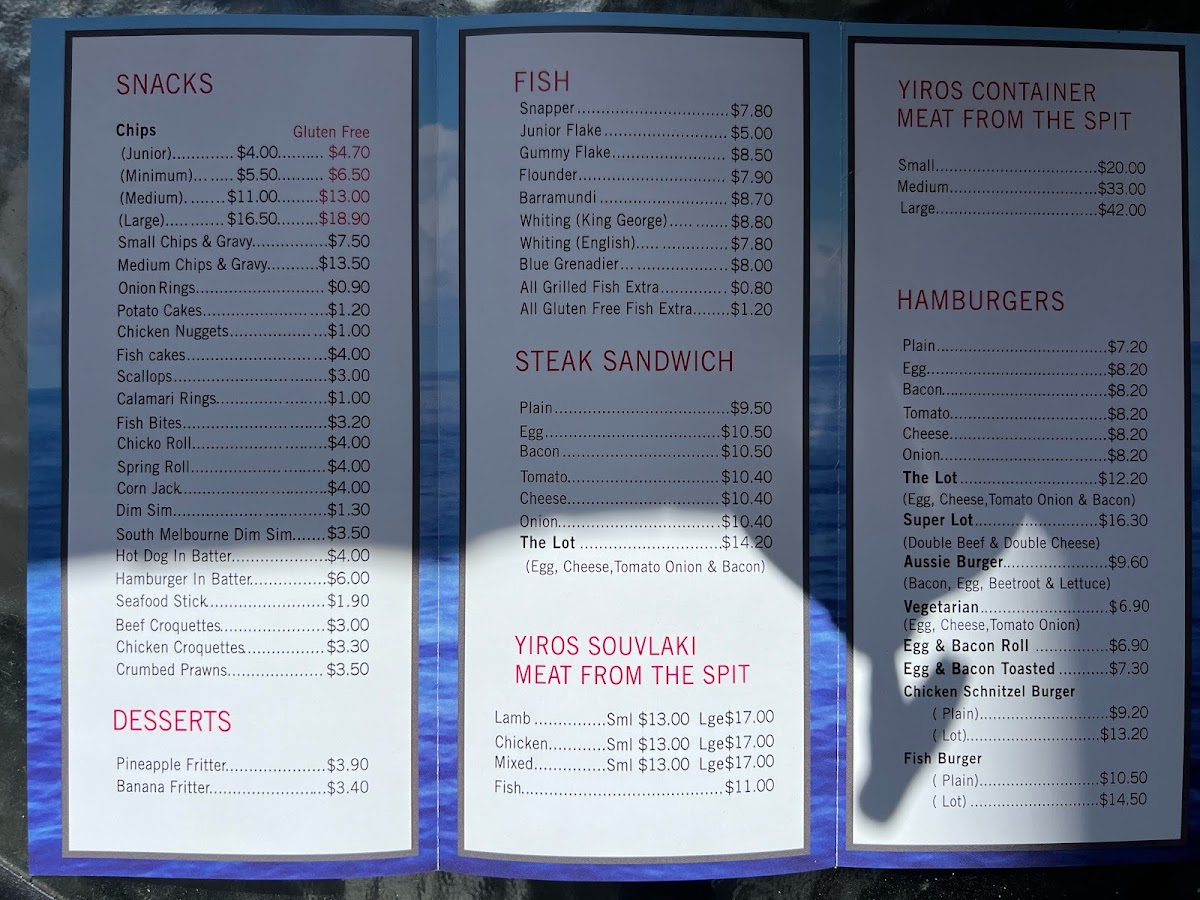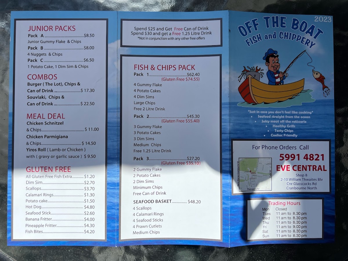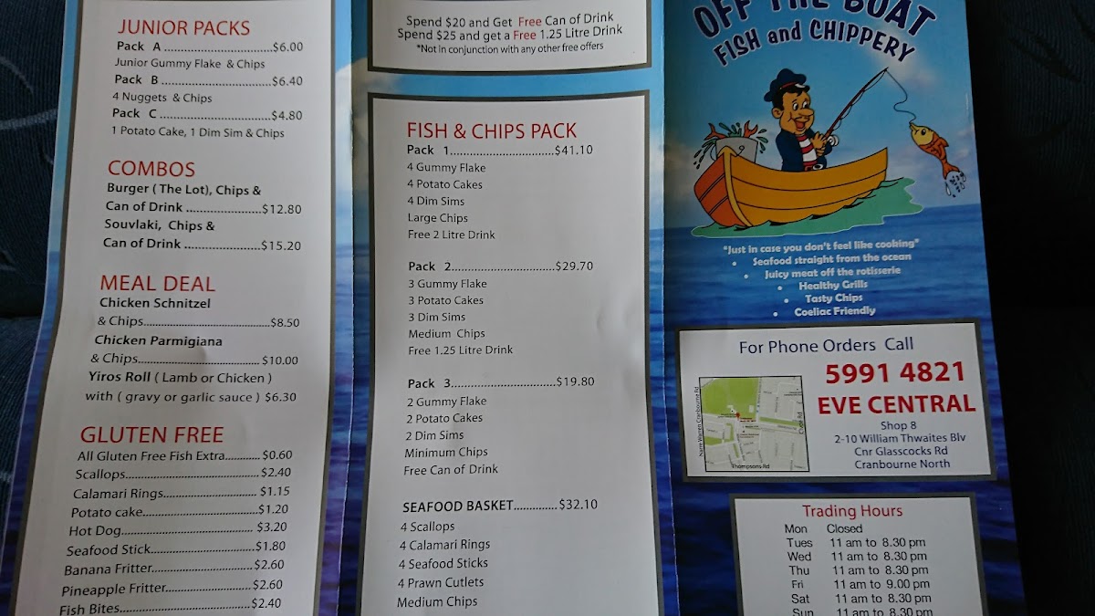 The menu at Off The Boat Fish & Chippery offers a delightful variety of dishes, with something for everyone. For snacks, you can enjoy Onion Rings, Potato Cakes, Chicken Nuggets, and Fish Cakes. If you're in the mood for fish, options like Snapper, Junior Flake, Gummy Flake, Flounder, and Barramundi are all available. The Steak Sandwich comes with choices such as Bacon, Tomato, Cheese, Onion, or The Lot, while hamburgers offer similar customizations like Bacon, Tomato, Cheese, Onion, or the hearty Super Lot. For a sweet treat, Pineapple Fritter and Banana Fritter make for great desserts. Those looking for something different can indulge in a Yiros Souvlaki with options like Lamb, Chicken, or Mixed. The Junior Packs include a Pack C for younger diners. Meal deals feature options such as Chicken Schnitzel, Calamari Rings, Potato Cake, Hot Dog, and Seafood Stick. If you're gluten-free, you can opt for Scallops, while other meals include Chicken Parmigiana, Yiros Roll, Souvlaki, and a Seafood Basket. The variety of dishes, ranging from classic fish and chips to satisfying burgers and tasty desserts, ensures there’s something for every taste.